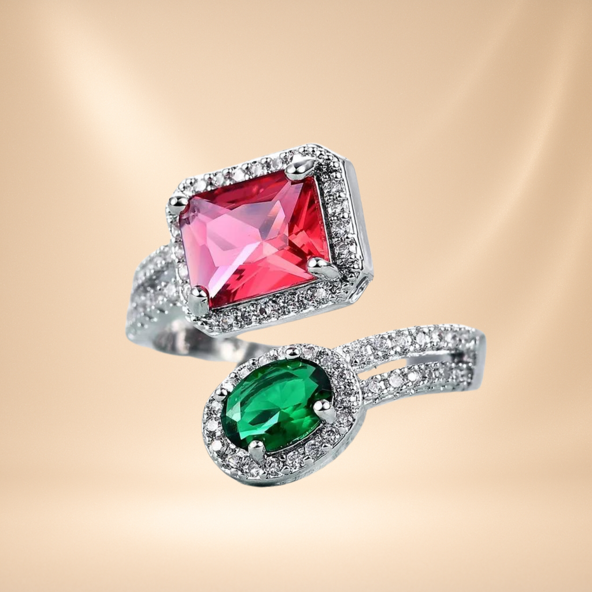A metal ring framed by small zircon stones with two large colored zircon stones.